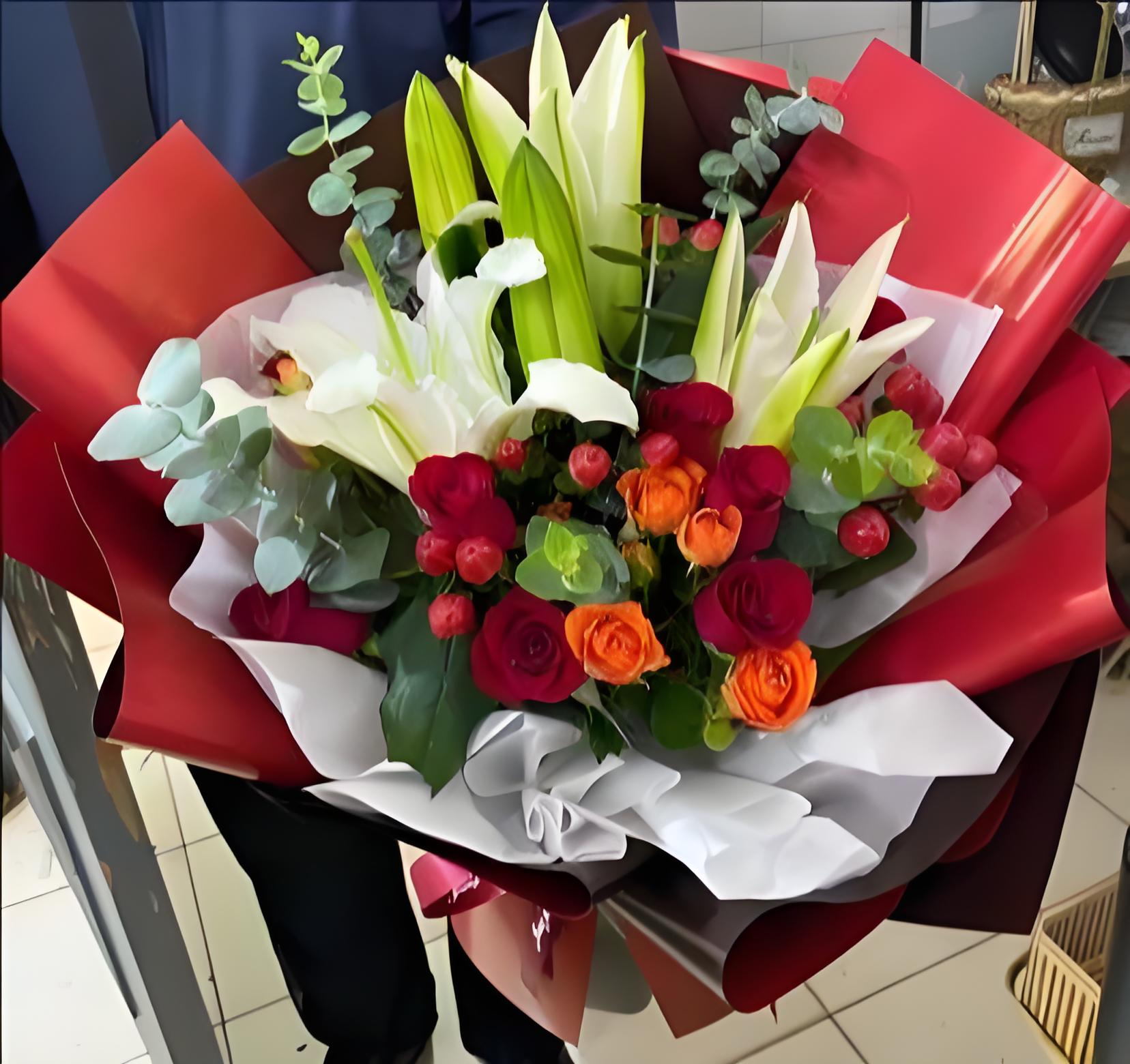 阜阳颖东区花店包11枝红玫瑰、2枝多头白百合、6枝橙色多头玫瑰、红豆、尤加利叶